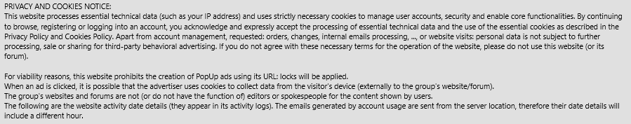It is important that the user clearly understands that, as is logical, with the account usage he/she is accepting and consenting to all the uses that the website makes (automatically or through the tasks of the administration department) of the data contained in the user account, in accordance with the content of the document of the group: 'Terms (conditions of use) & Privacy Policy' (with the unique objective of enabling the functioning of the website and/or facilitating the processing for which the data were collected and/or used automatically by the website/forum and/or were required/requested in accordance with the content of that document of the group).